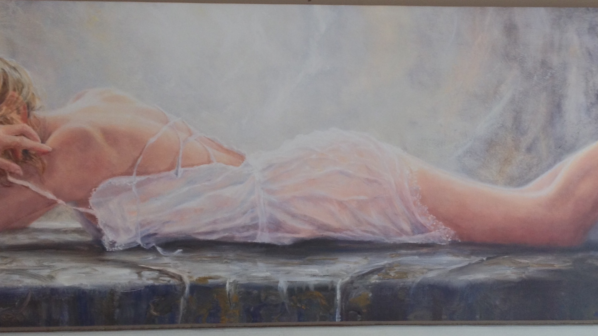 I have always been one of those people who is very easily distracted. I was always told off for daydreaming as a child and now quite often when I watch my four year old son I see the same quality - his concentration jumping from one thing to the next. Even as an adult when I know I should be more disciplined I quite often come around to find I have been off in my own world for some time. At the showroom it is very easy to be distracted. I particularly love to lose myself in some of the lovely art work we have here. Pictures of people are my favourite. I am always wondering what they are thinking or talking about. Today its this lovely lady that keeps catching my eye. I was up very early this morning and it looks to me like she might be ready to snuggle down for a sleep - think I may be projecting!