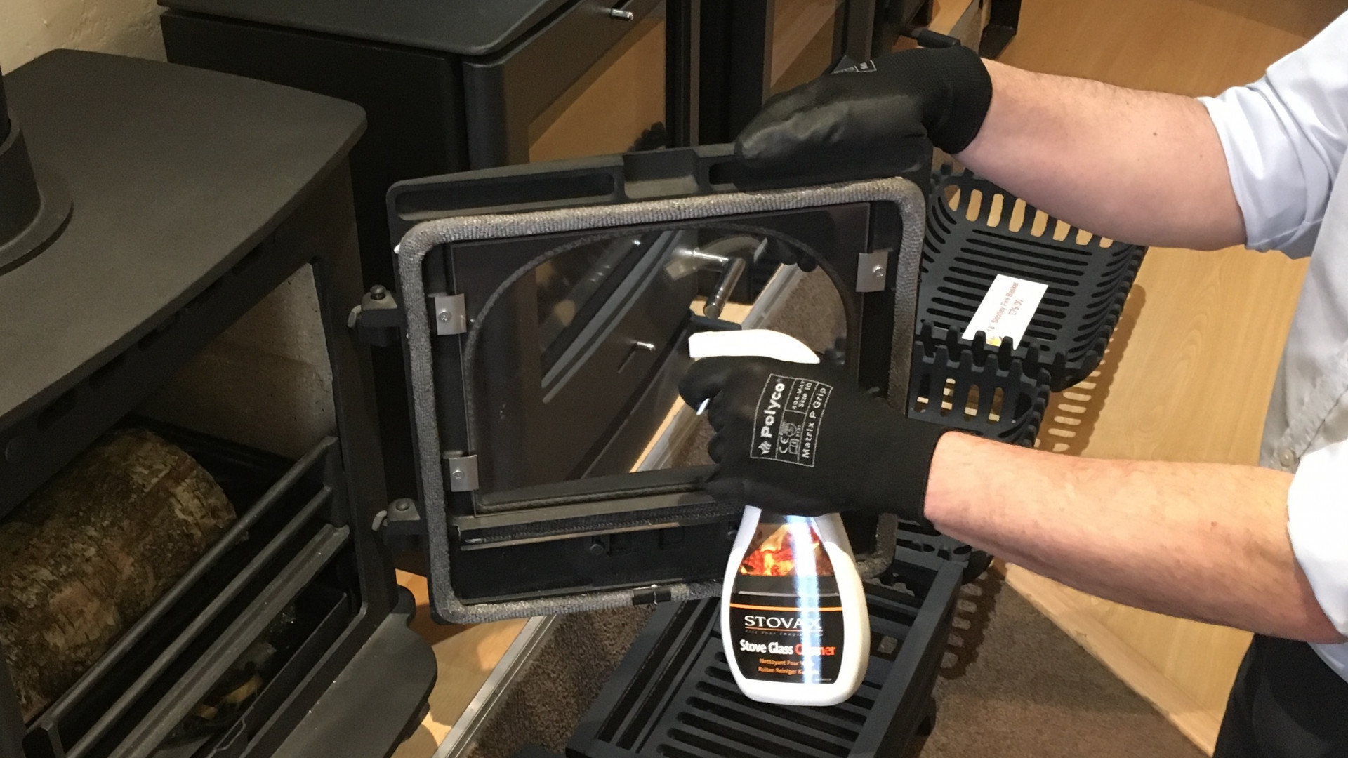 Step 1 - Choose your cleaning product. At the Fire Basket we sell two types of glass cleaner; the Stovax Clear Glass Gel Cleaner and the Stovax Glass Cleaner.