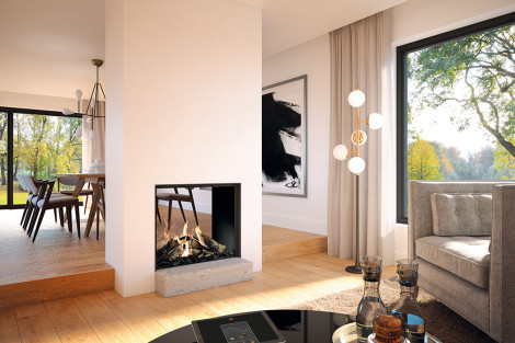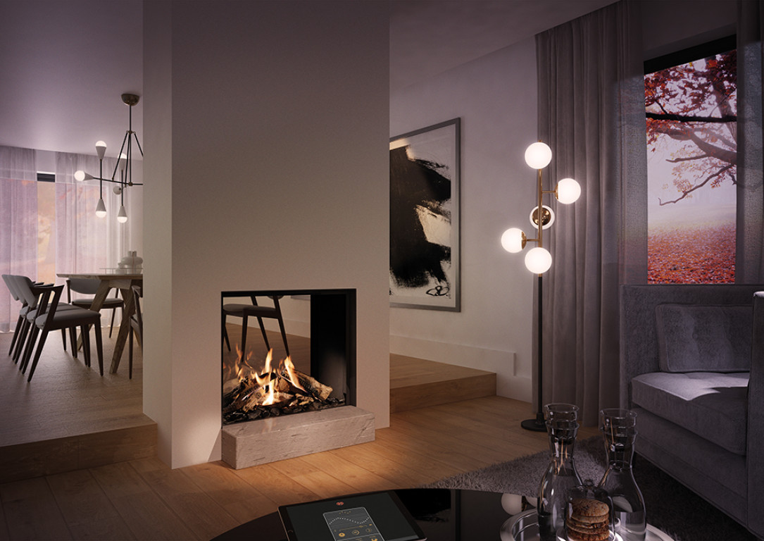 The DRU Maestro 75 Tunnel Eco Wave is this spectacular room divider for a dining room and living room, kitchen or even conservatory. This fire has black side walls and the Dynamic Flame Burner. This unique burner is actually built into the ceramic wood logs, causing the flames to wrap around them.