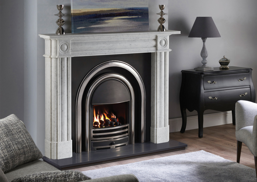 Pictured in Carrara Marble with a Provident Highlight Back Panel, Omega Gas Fire with a Provident Highlight Fireframe and Honed Granite Hearth. The Regent is also available in Aegean Limestone.